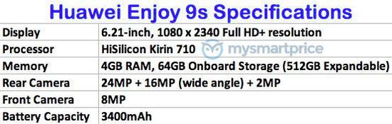 其他方面,華為暢享9S采用6.21英寸19.5:9比例的屏幕,分辨率為2340x1080,搭載麒麟970處理器,輔以4GB內(nèi)存和64GB存儲(chǔ)組合,可能還會(huì)推出128GB版本。配備3400mAh容量電池,系統(tǒng)方面裝備基于Android 9 Pie的EMUI 9.0。