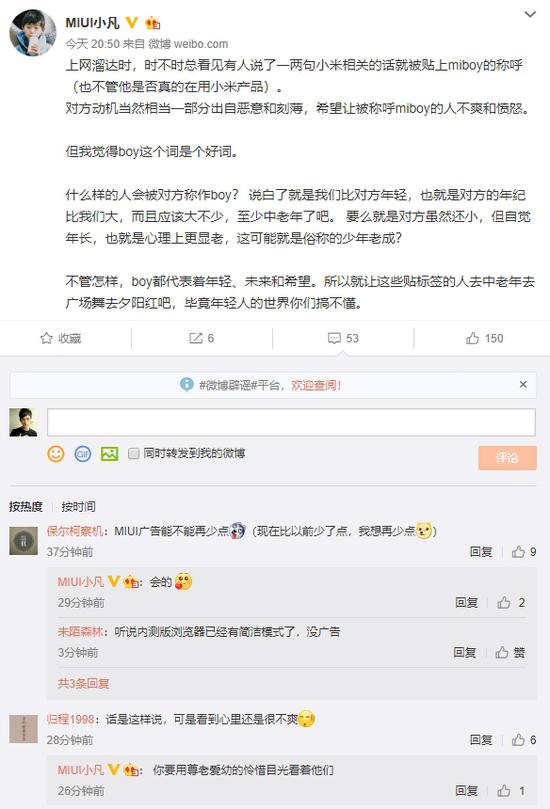 7月31日與網(wǎng)友互動時,小米產(chǎn)品總監(jiān)、MIUI體驗總負責(zé)人@MIUI小凡 回應(yīng)網(wǎng)友稱,會盡快整治、減少MIUI廣告,提升系統(tǒng)穩(wěn)定性。
