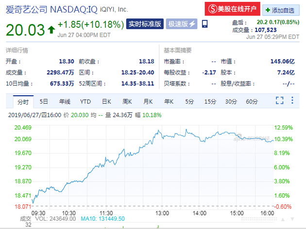 北京時(shí)間6月28日早間消息,周四,愛(ài)奇藝股價(jià)大漲10.18%報(bào)20.03美元,創(chuàng)逾四個(gè)月來(lái)最大漲幅。